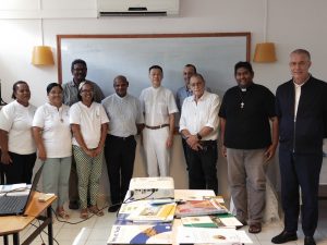 Du lundi 18 novembre au mercredi 20, Mgr Pascal CHANE TENG, accompagné de Jacques CORRÉ, P. Fabrice ELLAMA, Vicaire Général, P. Rodolphe EMARD, Responsable du Service Diocésain de la Pastorale Catéchétique et du Service Diocésain du Catéchuménat, D. Jacques FOURNIER, responsable du Service Diocésain de la Formation Permanente, sont allés à l’île Maurice pour rencontrer l’équipe du Service Diocésain de la Catéchèse et du Catéchuménat, placé sous la responsabilité de Frère Guylain PADIACHY S.F.A (SDCC, https://dioceseportlouis.org/services-diocesains/catechese-et-catechumenat) ainsi que l’équipe responsable du Service Diocésain de l’Enseignement Catholique (SDEC, https://dioceseportlouis.org/services-diocesains/education) et cela pour voir comment s’était mise en place la démarche synodale enclenchée depuis 2013 par le Diocèse de Port Louis… Et cette démarche avait abouti au Projet Catéchétique Diocésain Kleopas, promulgué le dimanche 31 juillet 2016 (https://dioceseportlouis.org/vivre-sa-foi/kleopas).